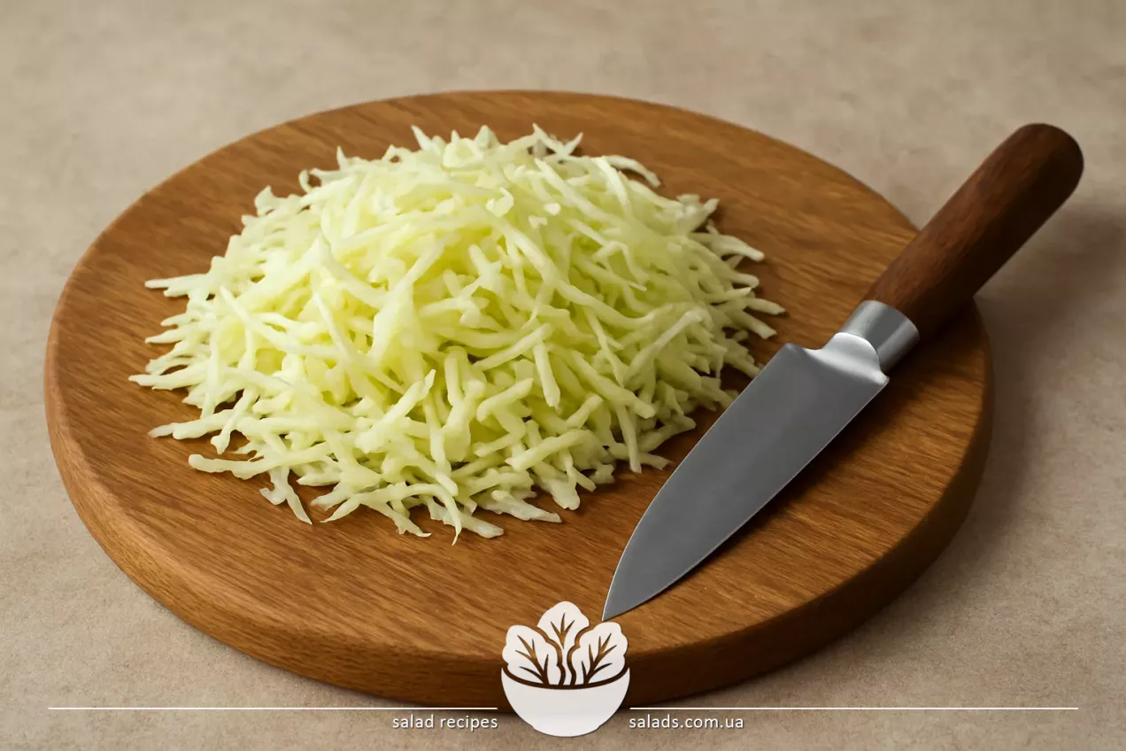 I take a firm head of cabbage and slice it into thin strips – the thinner, the more tender the salad. Then I add a pinch of salt and gently rub it with my hands – for about half a minute, so the cabbage becomes softer but keeps its crunch. After that, I let it sit while I prepare the other ingredients.