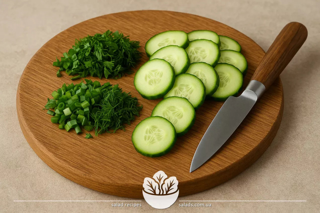 I usually slice the cabbage thinly and rub it slightly with a pinch of salt – this helps it absorb the oil better and become softer without losing crunch. I cut cucumbers into half-moons or thin strips – depending on their size. I add herbs as available – dill, parsley, sometimes a bit of basil. I always include chopped green onions – they add freshness without overpowering the salad’s mild taste. If I want a bit of spice – I add a few thin slices of red onion.