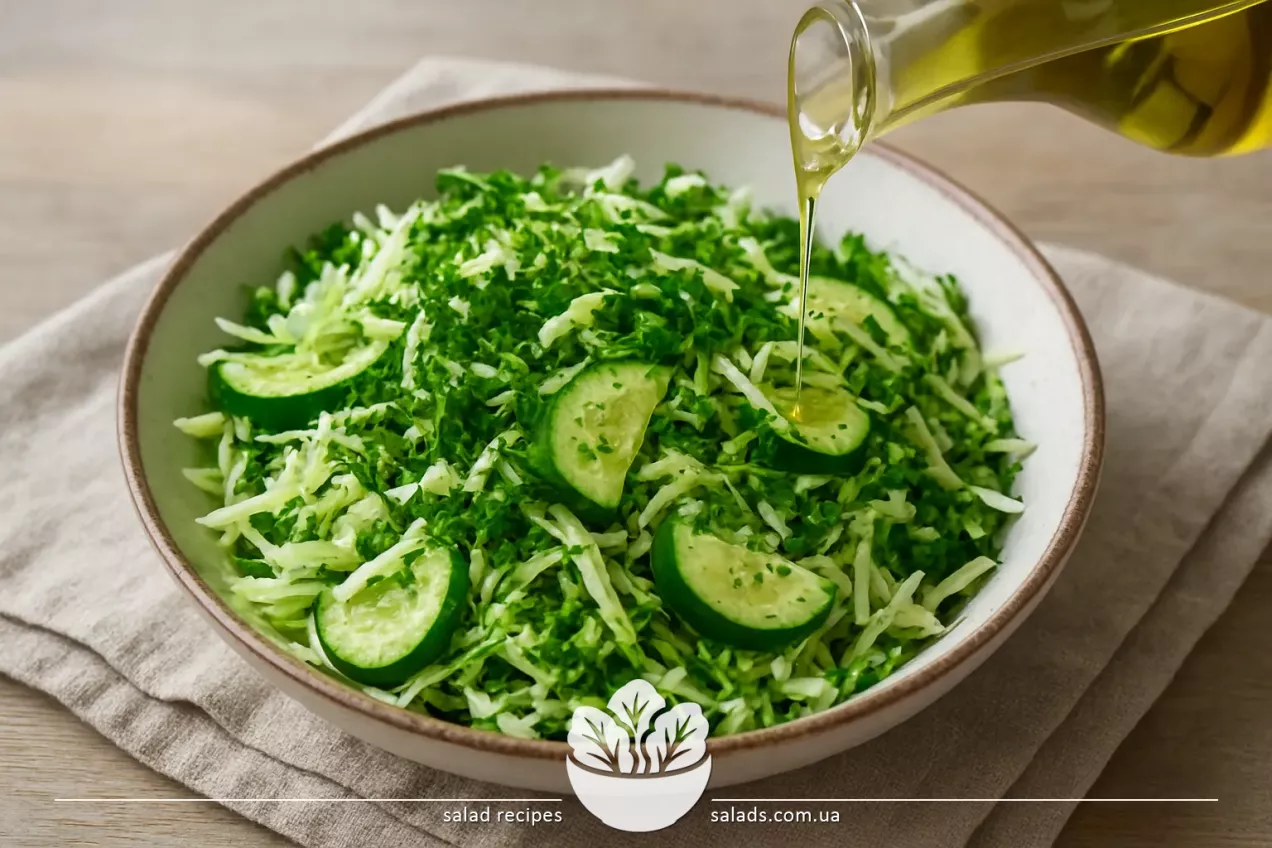 In a large bowl, I combine cabbage, cucumbers, green onions, and herbs. I add a little ground pepper – carefully, so as not to overpower the delicate flavor. Then I pour in unrefined sunflower oil – I prefer this one in the salad because of its rich, intense aroma. I mix everything gently with a spoon or by hand – to preserve the texture of the vegetables.