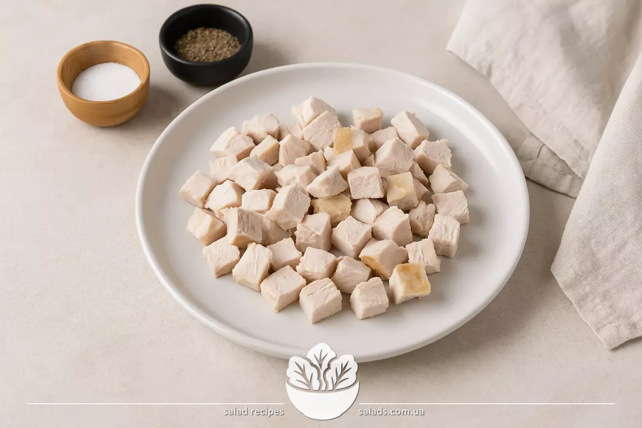 I always start with the chicken: I rinse the fillet, remove any membranes, and boil it in lightly salted water over low heat until cooked – about 20-25 minutes. It’s important not to overcook the meat, as it will become dry. After boiling, I leave the fillet to cool right in the broth – this helps keep it juicy. Then I cut it into small, neat cubes.