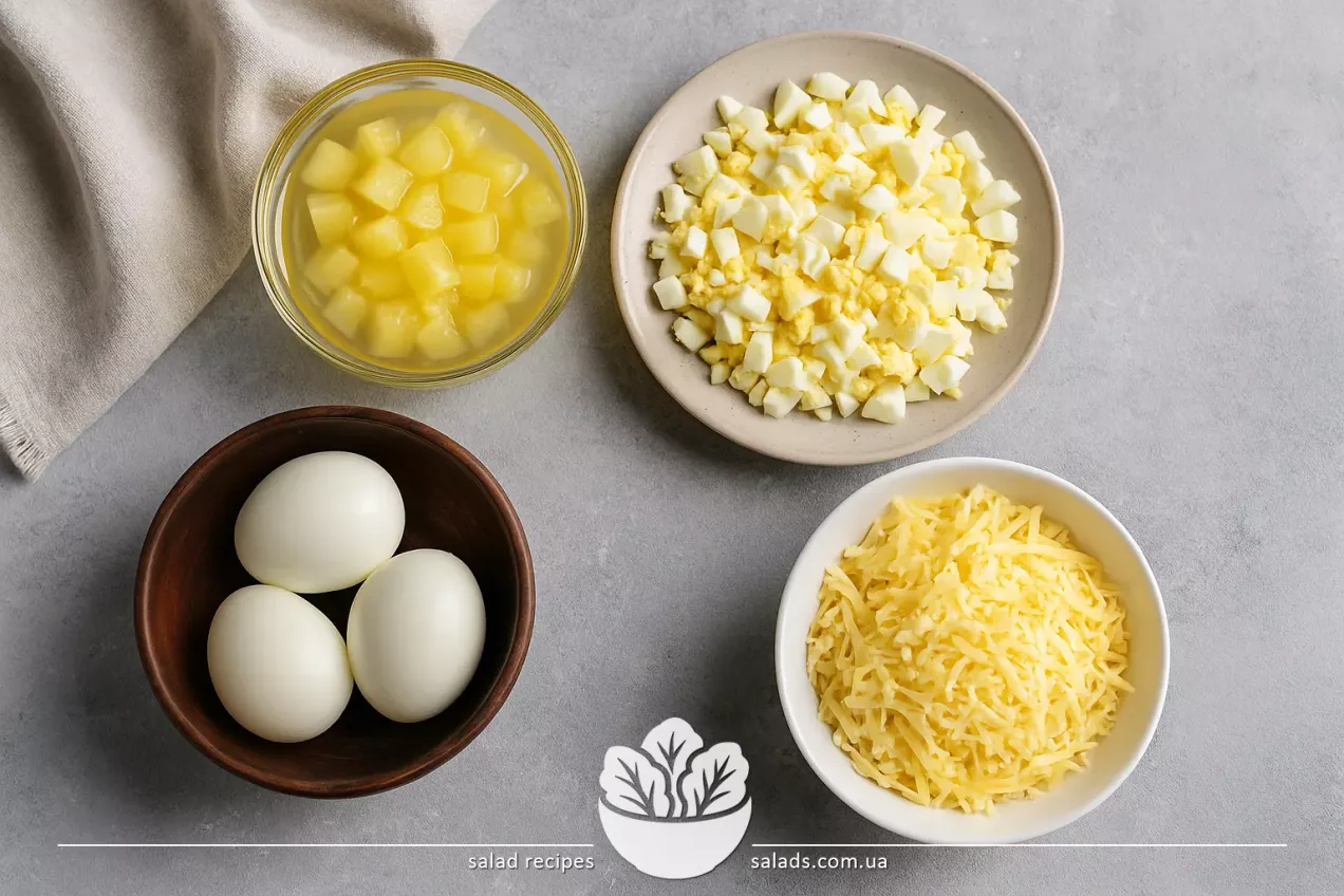 While the chicken is cooking, I move on to the other components. I hard-boil the eggs – 10 minutes after boiling starts, cool them in cold water, peel and finely chop. I choose hard cheese with a pronounced flavor and grate it on a medium grater. I always drain the pineapple well using a sieve or gently press it with a spoon to remove excess juice.