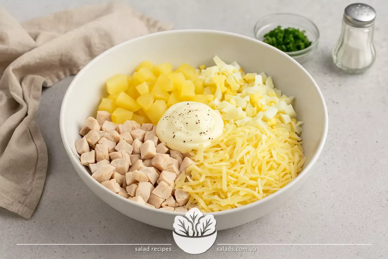 In a large bowl, I combine the chicken, eggs, cheese and pineapple. I add the mayonnaise – not all at once, but gradually, to control the texture. Then I season with salt and pepper and gently mix with a spoon to maintain the shape of the cubes. Sometimes I reserve a little cheese for garnishing before serving.