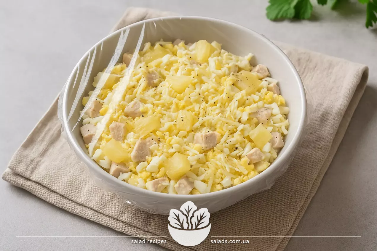 I often make this salad for festive gatherings – New Year’s, Easter, kids’ birthdays. And there’s always someone who asks for the recipe or compliments it as “very tasty and unusual.” Another bonus: it can be made in advance – the longer it sits in the fridge, the better the flavors meld together. If I don’t have boiled meat on hand, I substitute with smoked chicken – it gives a more piquant taste. And when I want a lighter version, I use homemade yogurt instead of mayonnaise or mix sour cream with mustard. Still, the classic for me is boiled chicken breast, canned pineapple, eggs, cheese and mayonnaise. Even kids enjoy this salad – and let’s be honest, that doesn’t happen too often.