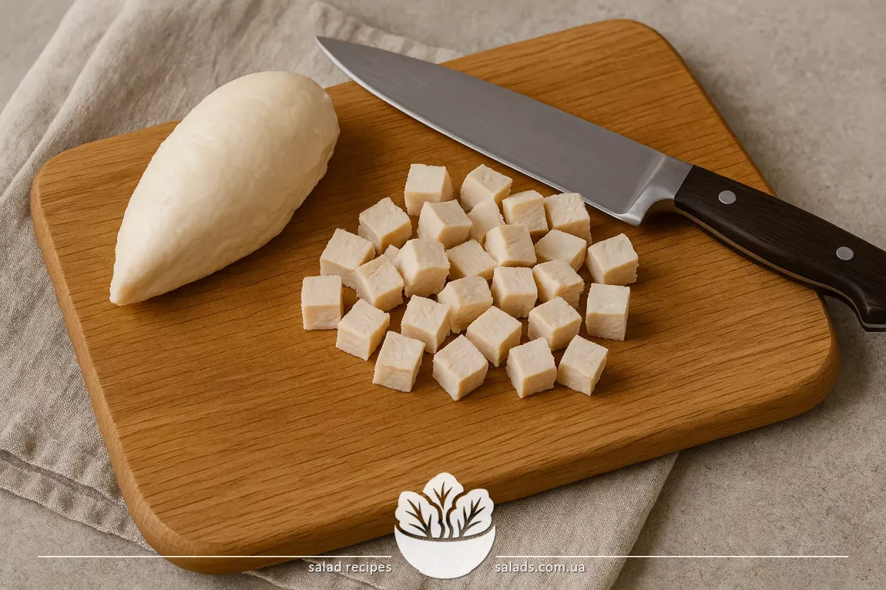 Je rince toujours le poulet, j’enlève les membranes et je le fais cuire dans de l’eau légèrement salée à feu doux – cela permet à la viande de rester tendre et juteuse. En général, 20 à 25 minutes suffisent. Je le laisse ensuite refroidir directement dans le bouillon – cela aide le filet à retenir l’humidité. Une fois refroidie, je coupe la viande en petits dés ou en lanières – selon les préférences. L’important est que les morceaux soient uniformes, cela rend la salade plus esthétique.