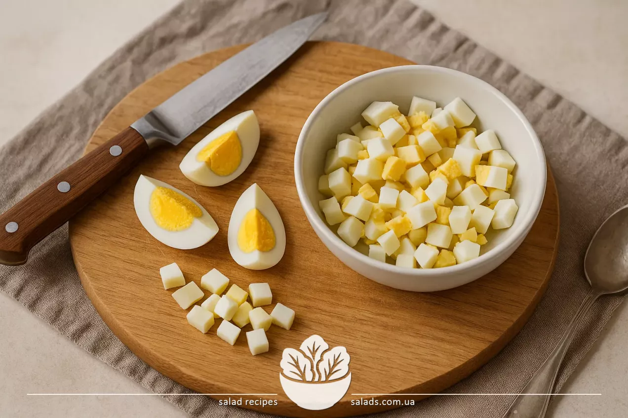 Je mets les œufs dans de l’eau froide, je porte à ébullition et je les fais cuire pendant 10 minutes pour qu’ils soient bien durs. Je les refroidis ensuite sous l’eau courante et je les écale. Je les coupe en dés ou en quartiers selon la présentation souhaitée. J’aime quand le jaune d’œuf se sépare un peu – cela ajoute du contraste. Je garde quelques morceaux à part pour la décoration.