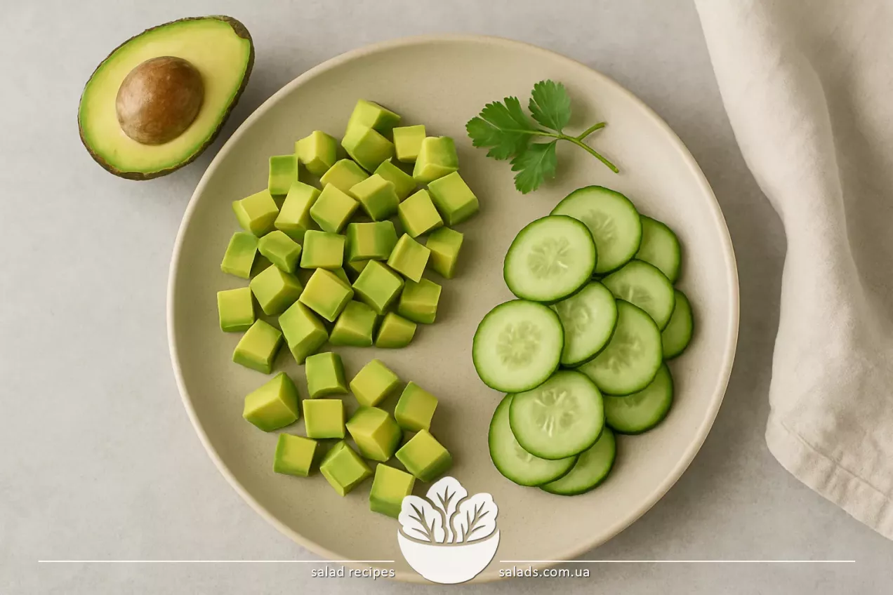 L’avocat doit être mûr – tendre mais pas trop mou. Je le coupe en deux, j’enlève le noyau, je retire la peau et je découpe la chair en dés de taille moyenne. Pour éviter qu’il ne noircisse, je l’arrose parfois de jus de citron. Je coupe le concombre en demi-rondelles fines ou en tranches – si la peau est dure, il vaut mieux l’enlever. Le croquant du concombre équilibre bien la douceur de l’avocat.