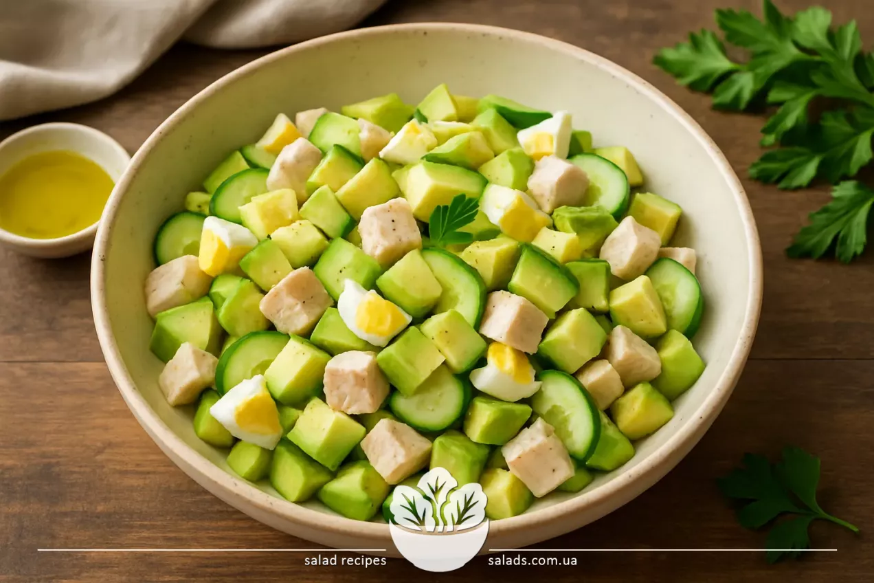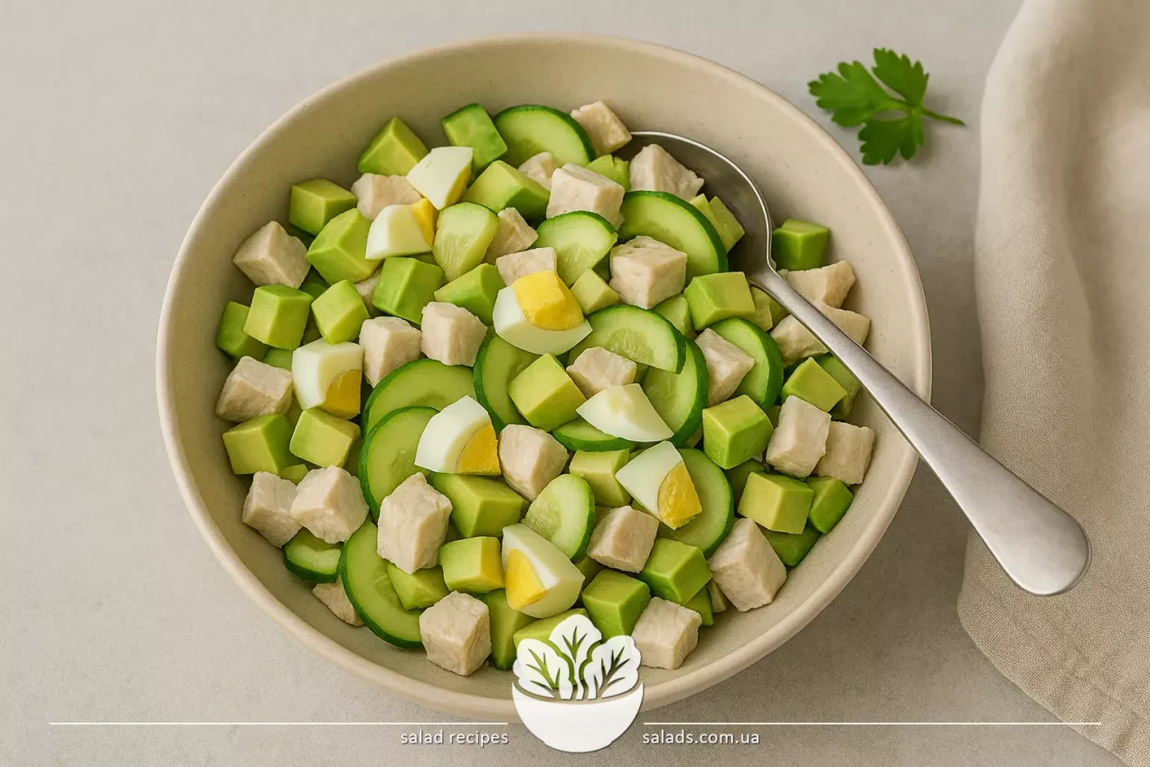 Je la prépare principalement pour le dîner ou un déjeuner léger. Elle est rassasiante sans être lourde. Grâce à l’avocat tendre, la consistance est douce et crémeuse, tandis que le concombre frais ajoute de la jutosité. Les ingrédients sont rapides à préparer – surtout si le poulet et les œufs sont cuits à l’avance. En général, je sers la salade immédiatement après la préparation, car l’avocat ne se conserve pas bien et perd vite sa couleur.