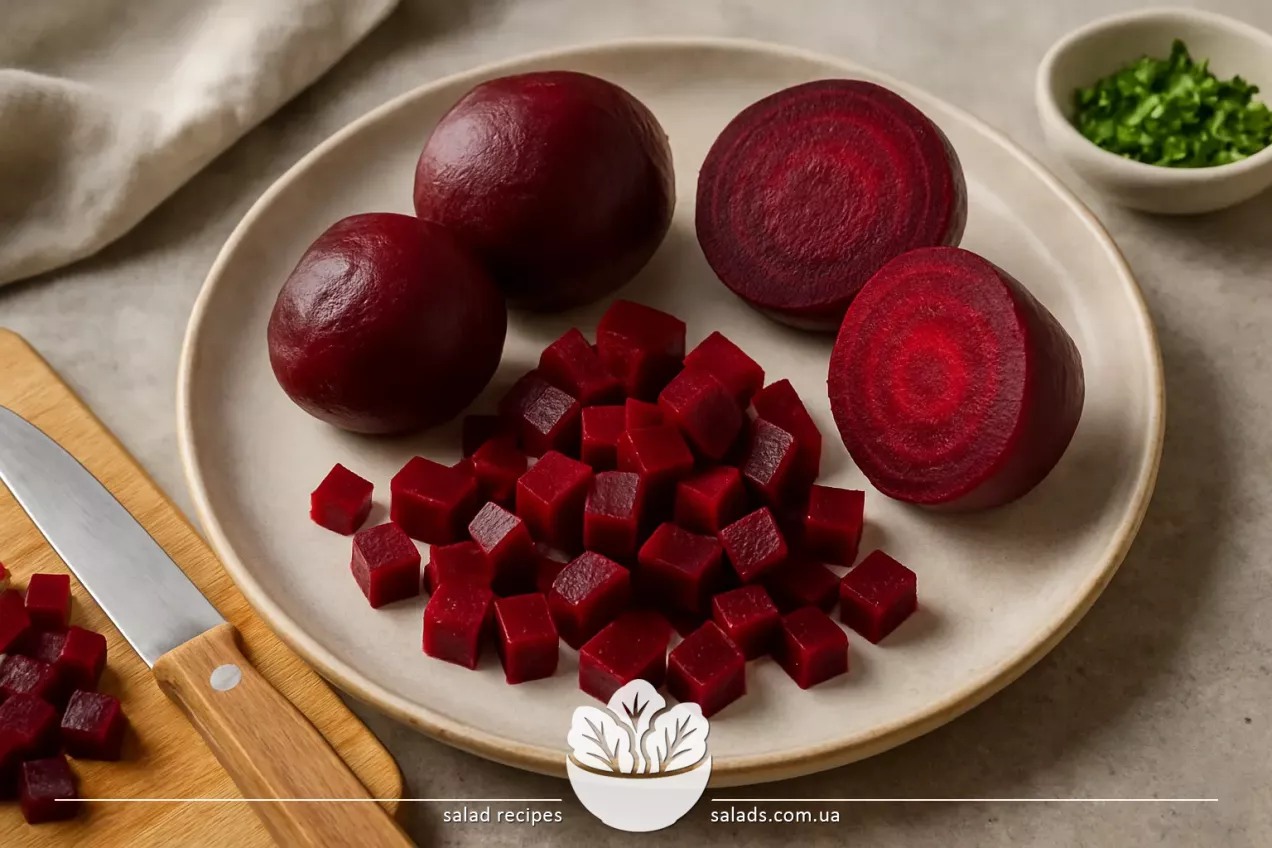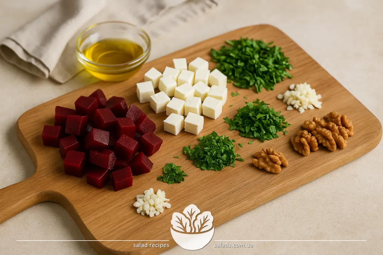 Заправка – лише олія, без майонезу або складних соусів. Найчастіше я використовую нерафіновану соняшникову, бо її аромат добре підкреслює смак буряка. Інколи додаю трохи лимонного соку або краплю бальзамічного оцту – залежно від настрою. Зелень беру ту, що є під рукою: кріп, петрушку або навіть мікс салатів. Волоські горіхи – мій улюблений додаток у цьому салаті. Вони створюють хрумкий контраст і роблять смак більш глибоким.
