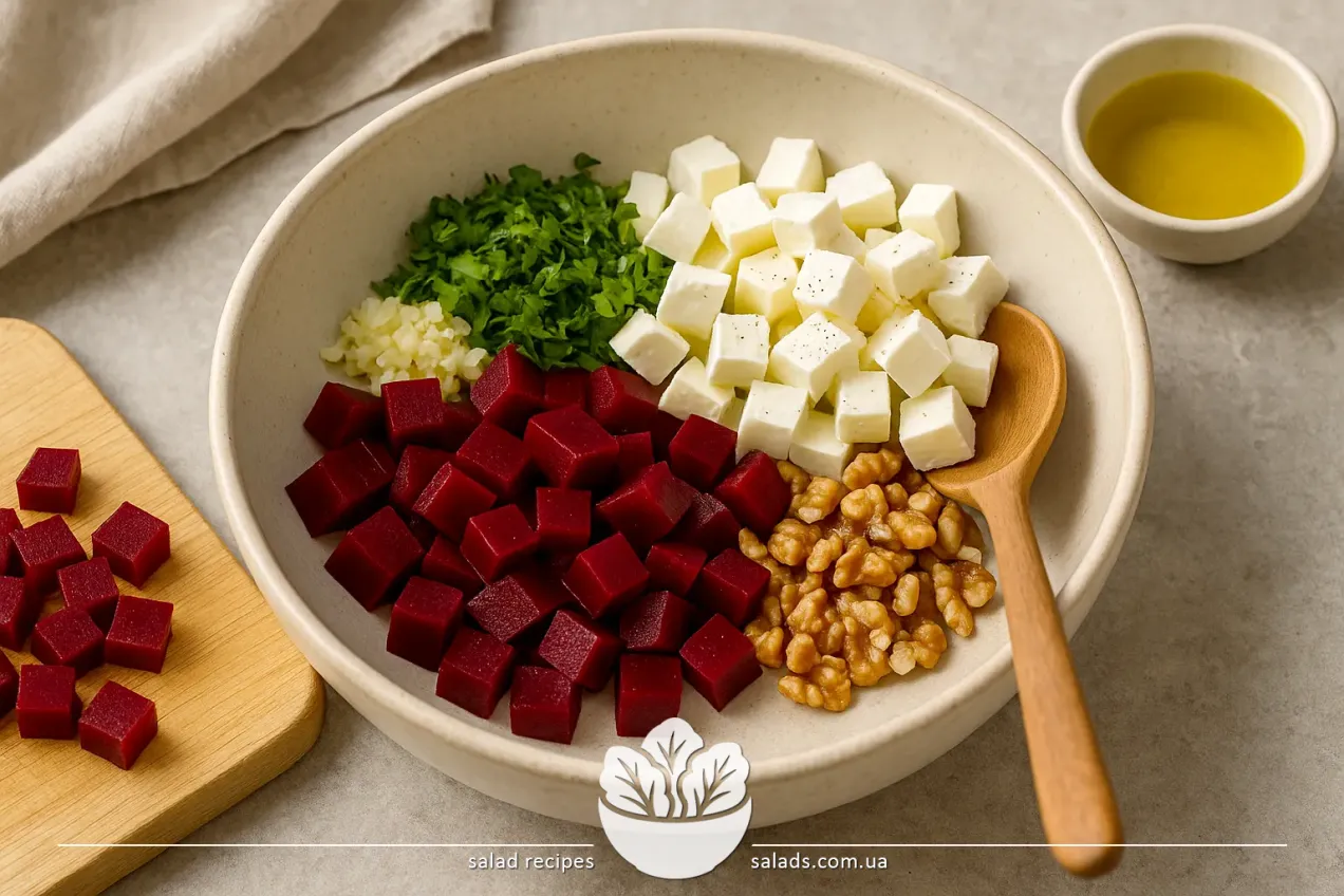 Фету я ріжу кубиками або розминаю пальцями, щоб вона ніжно розподілилася в салаті. Часник подрібнюю ножем або натираю, щоб він дав більше аромату. Горіхи часто трохи підсушую на сухій пательні – це посилює їхній смак. Зелень ріжу дрібно, але без фанатизму – мені подобається, коли вона помітна в страві.