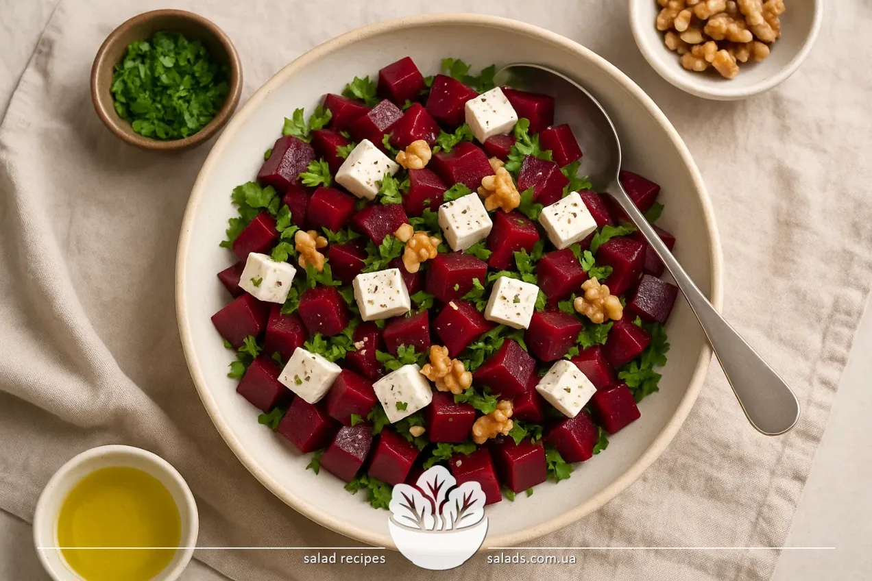 Салат із буряком і фетою я готую вже багато років – і щоразу він викликає захоплення як у домашніх, так і в гостей. Буряк у цьому рецепті не просто інгредієнт – це основа, що дарує солодку, насичену ноту, особливо якщо його запекти, а не просто зварити. Я часто готую цей салат як легку вечерю після насиченого дня – він ситний, але не важкий, а ще чудово тонізує завдяки натуральним інгредієнтам. У поєднанні з сиром фета, який я додаю великими шматочками або розкришую вручну, страва набуває характерної середземноморської нотки.
