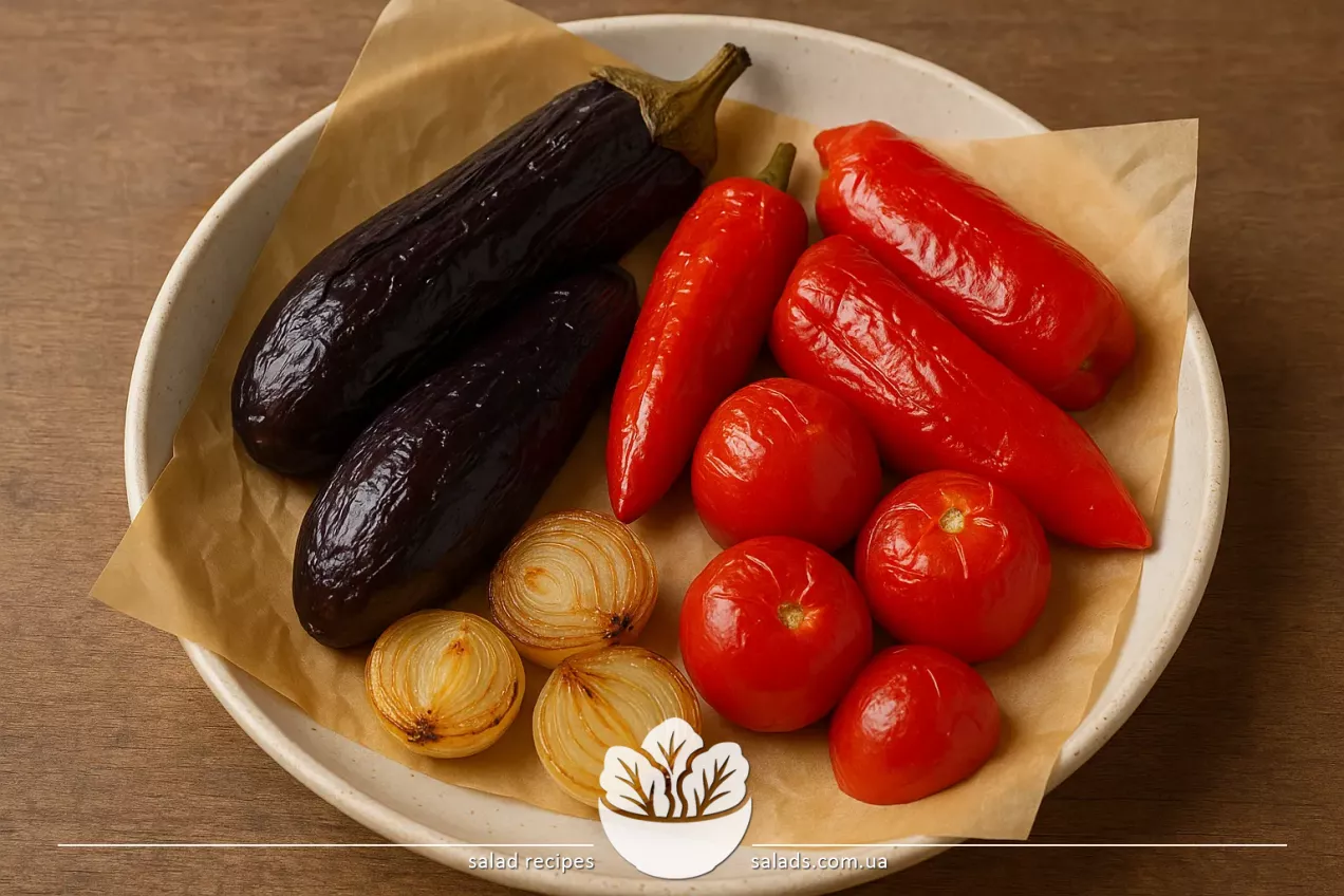 Я обычно готовлю овощи целиком, без нарезки перед запеканием – так они лучше сохраняют сок. Баклажаны, перец, помидоры и лук выкладываю на противень, застеленный пергаментом или слегка смазанный маслом. Запекаю при температуре 200°C около 30 минут – овощи должны подрумяниться и стать мягкими. Перец часто немного обугливается – именно это придает ему приятный аромат. После запекания обязательно даю овощам остыть и снимаю кожицу с перца.