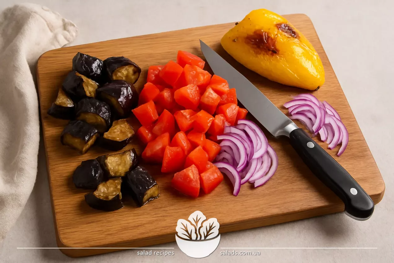 Когда овощи остынут, нарезаю их крупными кусочками или соломкой. Баклажаны должны быть нежными, но не превращаться в пюре. Помидоры режу аккуратно – они могут пустить немного сока, но это только улучшает заправку. Лук также нарезаю крупно. Чеснок либо натираю на мелкой терке, либо очень мелко рублю – он должен раствориться во вкусе, а не доминировать.