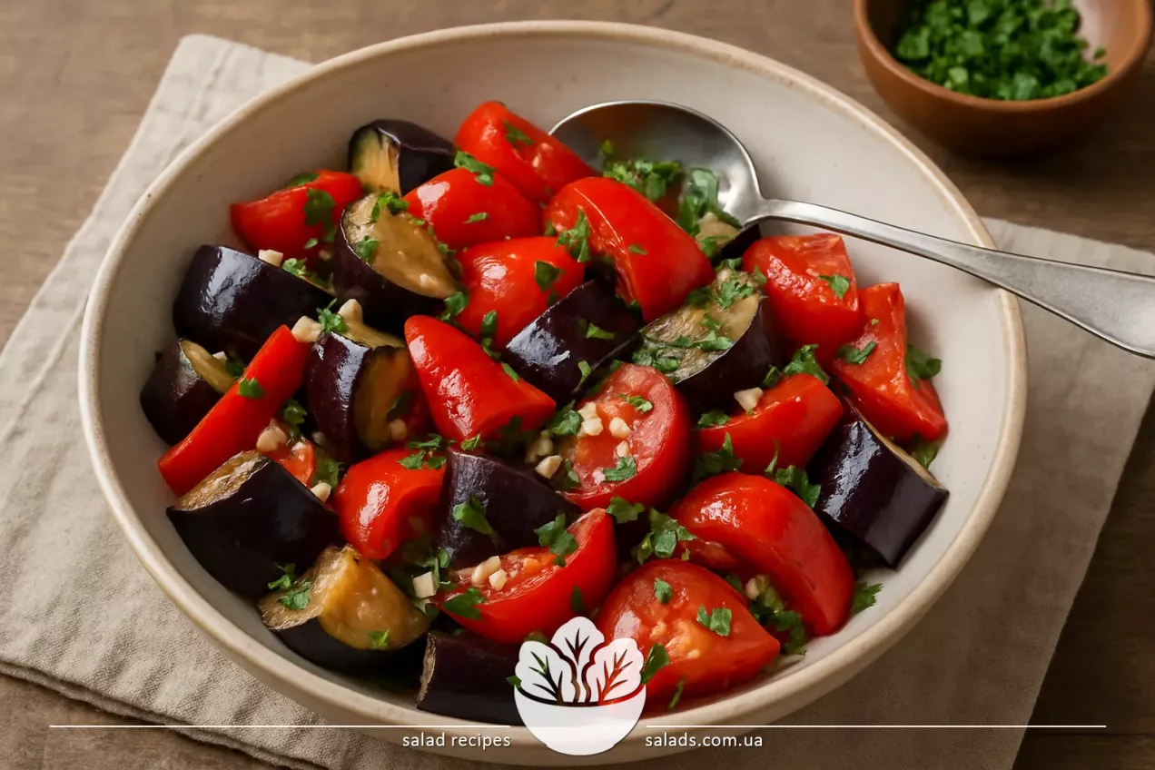 Салат по-разному воспринимается в зависимости от температуры. В теплом виде он более ароматный и напоминает овощное рагу, но без лишней жидкости. В холодном – становится легким, почти освежающим. Я часто подаю его с гренками или ломтиками хлеба. Он хорошо хранится в холодильнике до суток, но перед подачей лучше дать ему постоять при комнатной температуре.
