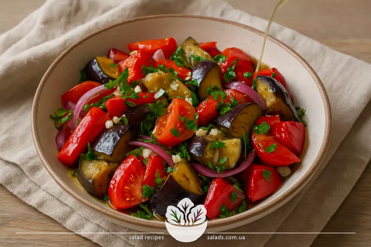 Обычно готовлю его на ужин или для гостей – он красиво смотрится, легко подается порционно и не требует больших усилий. Овощи запекаю вместе на противне – это экономит время. И хотя помидоры и перец становятся мягкими, их текстура не теряется, если дать овощам остыть перед нарезкой. Обязательно добавляю измельченный чеснок – он усиливает вкус, особенно в теплом варианте салата.