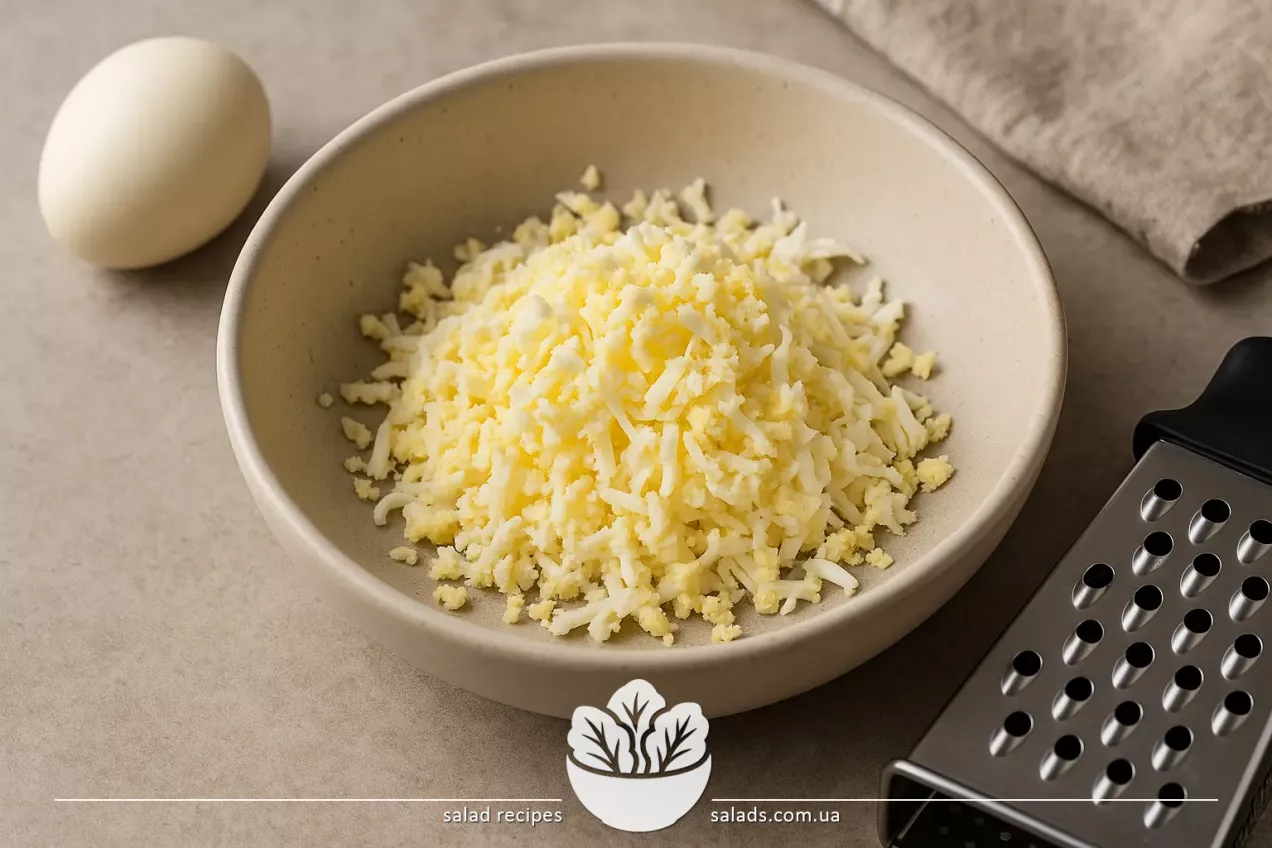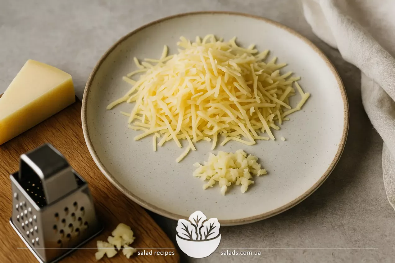 Чеснок в рецепте – на мой вкус обязателен: он добавляет характер, делает салат более пикантным. Но если я готовлю для детей или гостей, которые не любят острое, добавляю его совсем немного или заменяю на зелень. Чаще всего я использую сыр гауда или другой полутвердый сыр с нежным вкусом. Его натертая текстура хорошо соединяется с яйцом, и вместе они создают нежную основу салата. Майонез может быть классическим, домашним или магазинным, но всегда в меру, чтобы не сделать салат слишком жидким.
