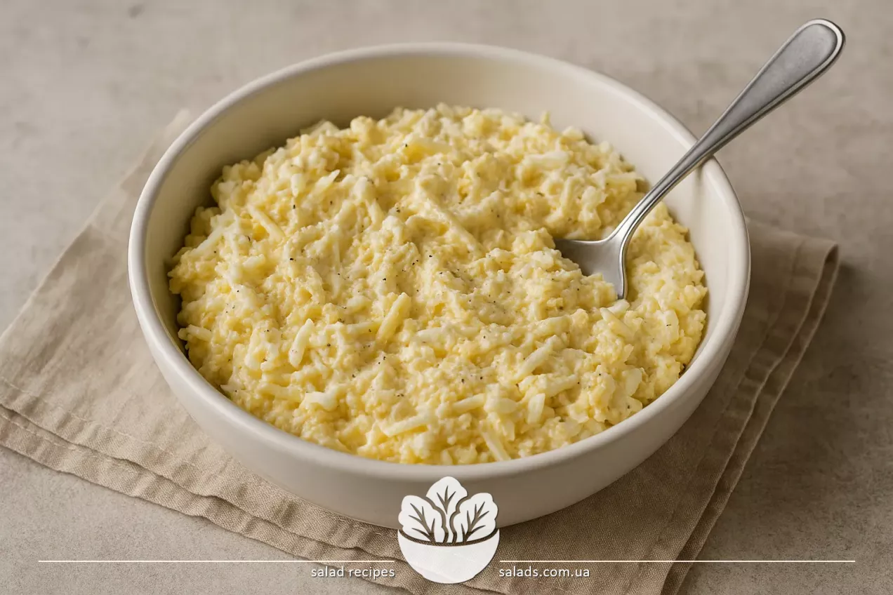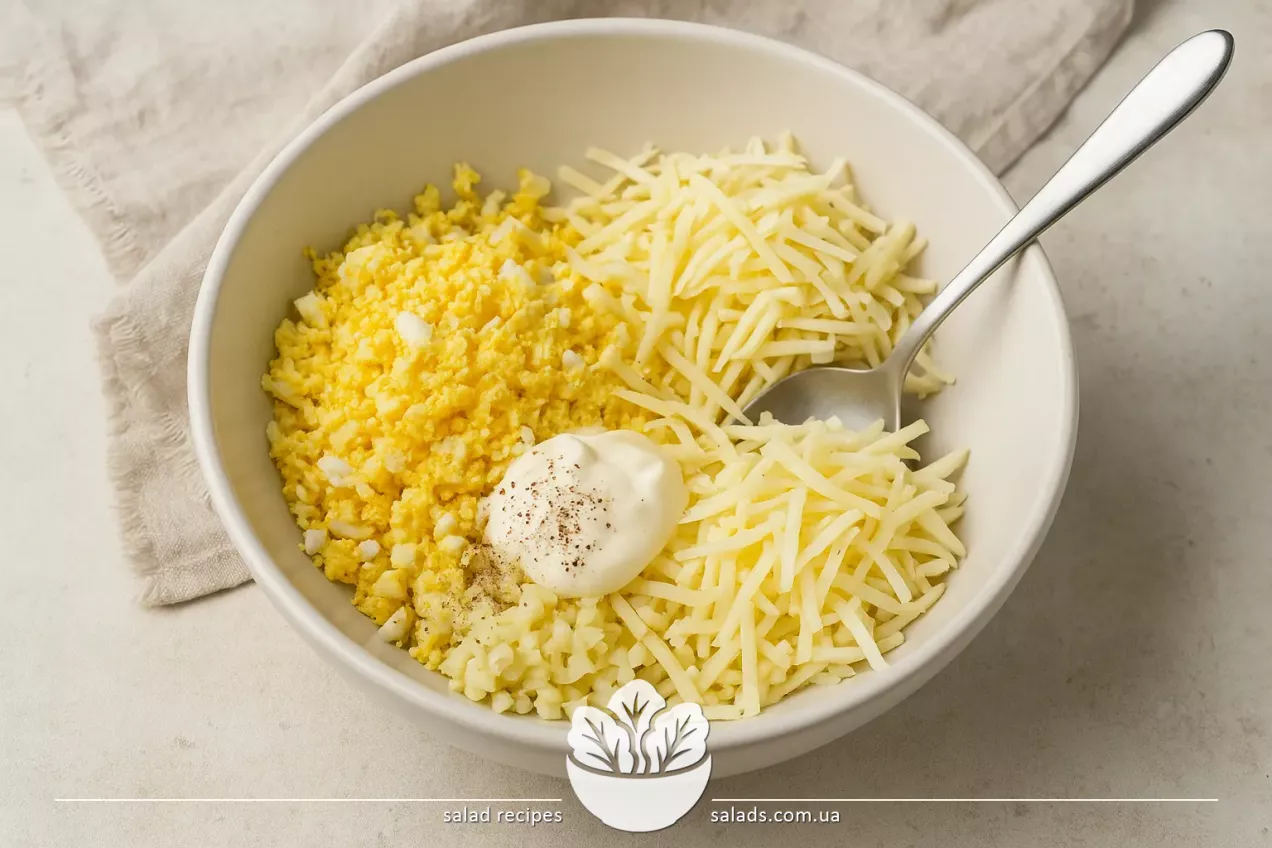 В большой миске соединяю яйца, сыр и чеснок. Добавляю майонез – по одной ложке, чтобы не сделать салат слишком жидким. Солю и перчу по вкусу. Затем хорошо перемешиваю вилкой или ложкой, пока масса не станет однородной. Если хотите, чтобы салат был еще нежнее – используйте блендер, но я обычно ограничиваюсь обычным перемешиванием.